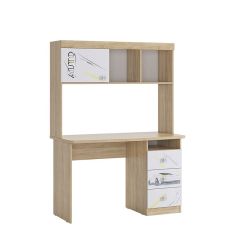Состоит из: столешницы, 3-х выдвижных ящиков и полки для книг с закрытой нишей и открытыми полками.